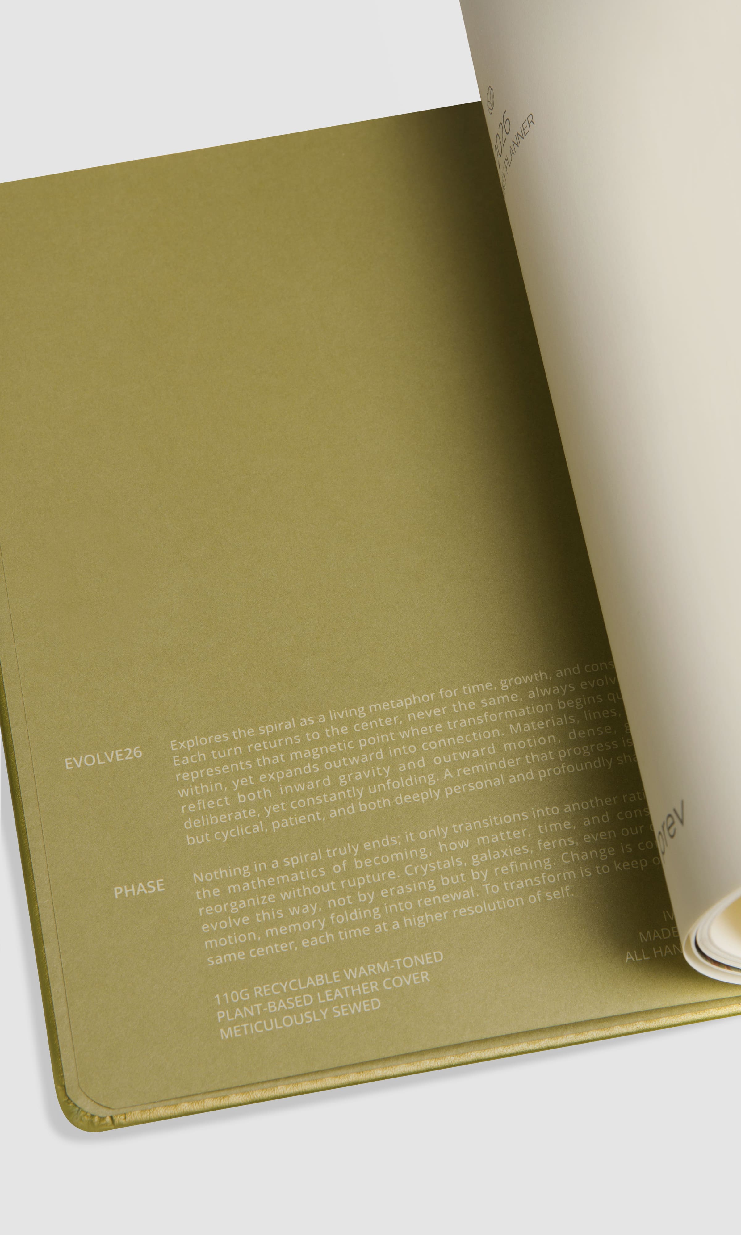 Phase embodies transition without rupture, the refinement of what already exists. Change that unfolds through continuity, repetition, and quiet reorganization. A year of evolution, renewed habits, and gentle transformation gathers here.