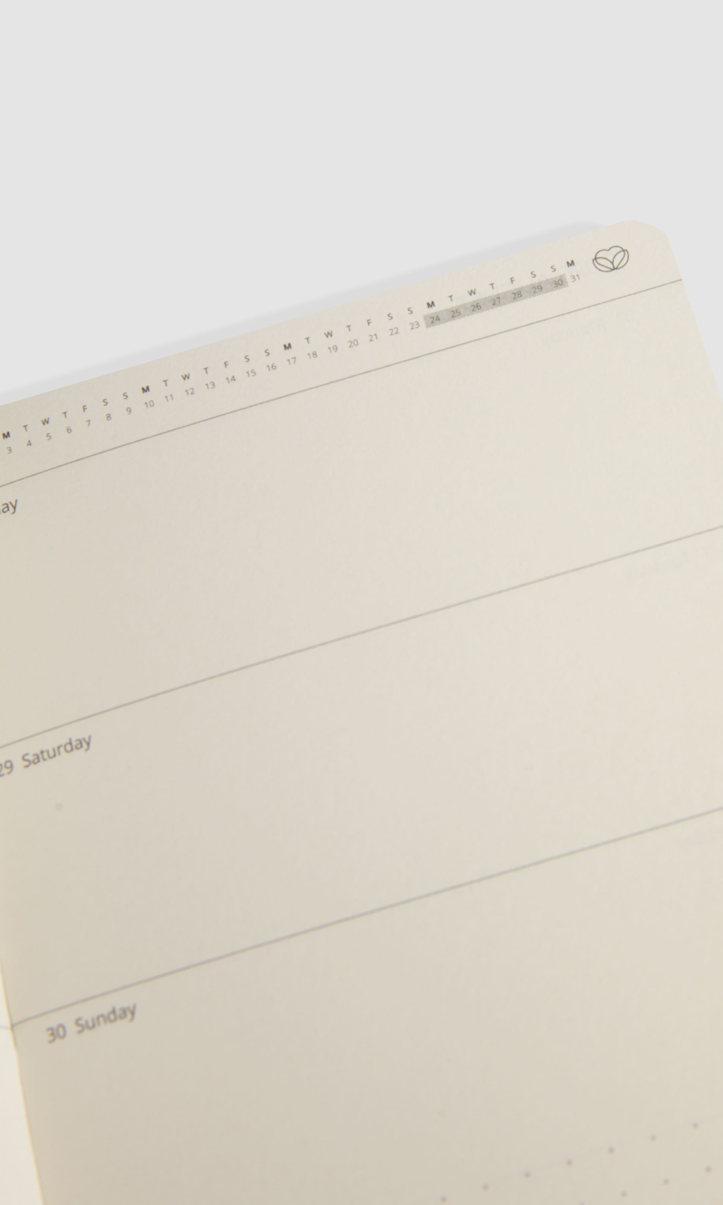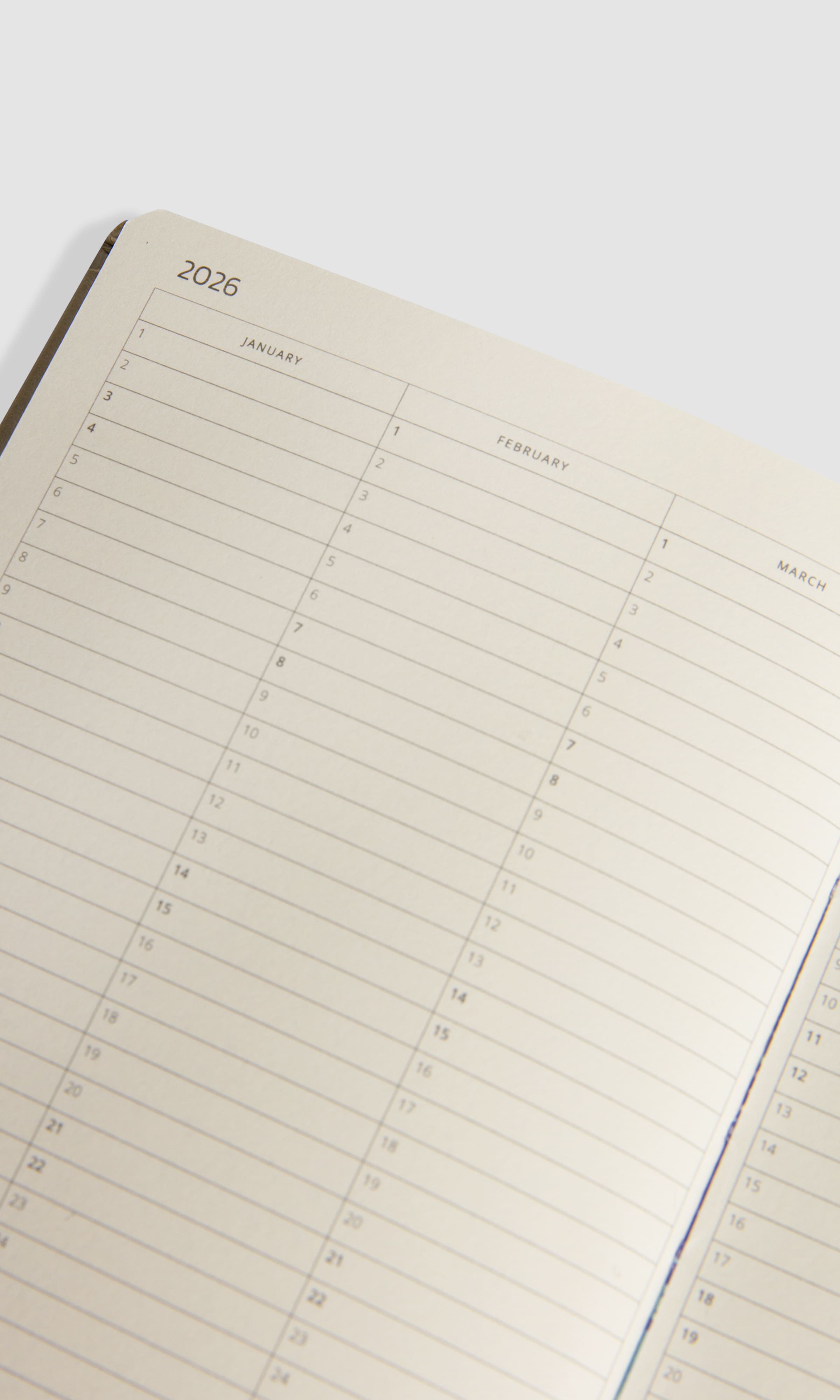A 2026 planner created with a simple aesthetic and for practical use. The warm-toned 110 g ivory paper prevents ink bleed-through, ensuring a clean look. Lightly printed text reduces eye strain, enhancing the overall writing experience.