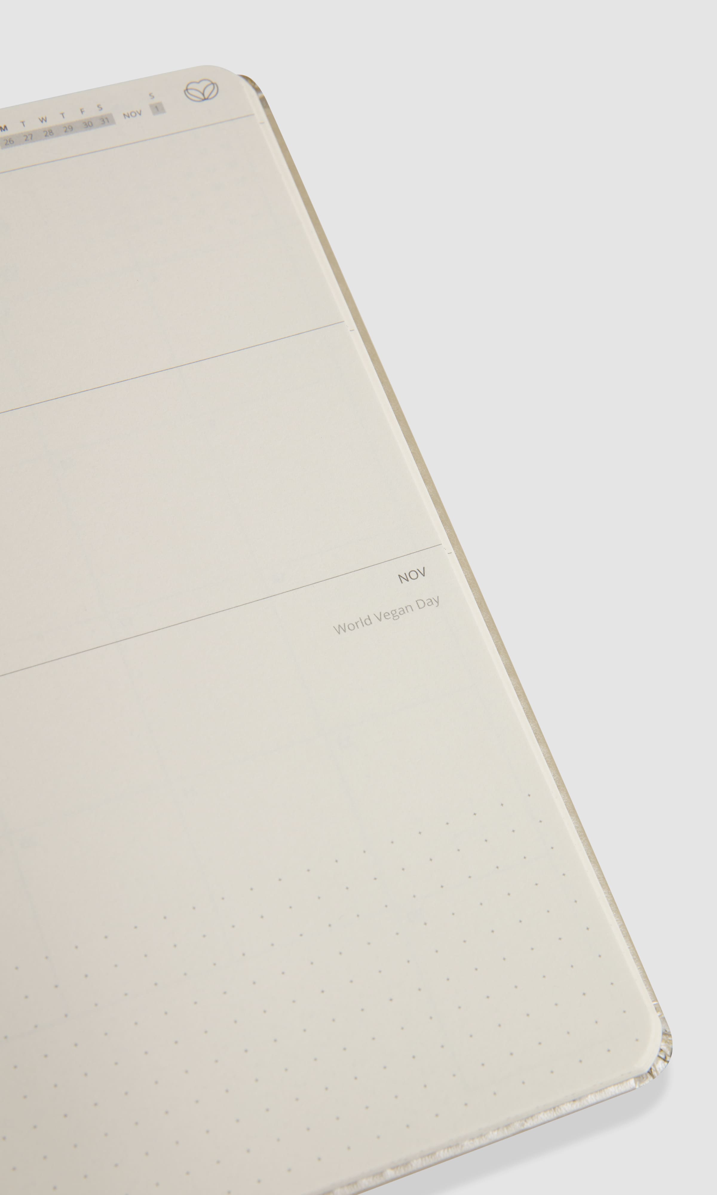 At the back, 35 blank dotted pages encourage creativity and offer a space for everything you need. To help you easily find the center of the page, the middle dots of the left, right, and bottom edges are made slightly more prominent. Inside of the back cover, you can write your phone number so that your planner can be returned to you if it gets lost. And over 100 meticulously crafted stickers, tucked into a back envelope.