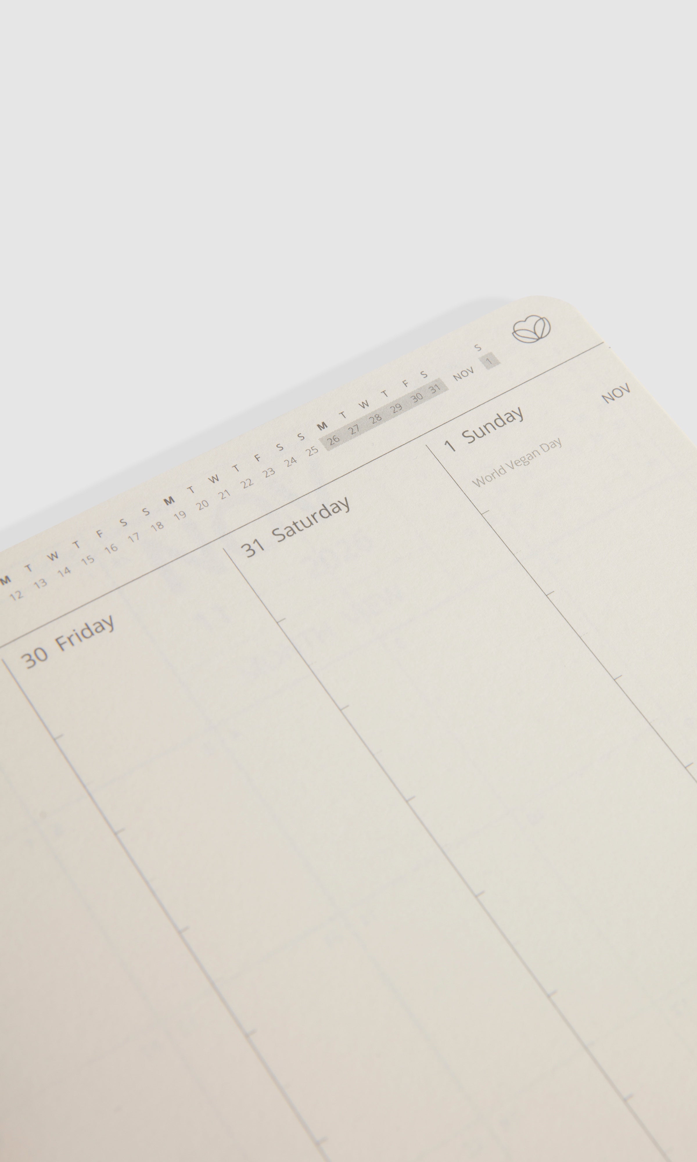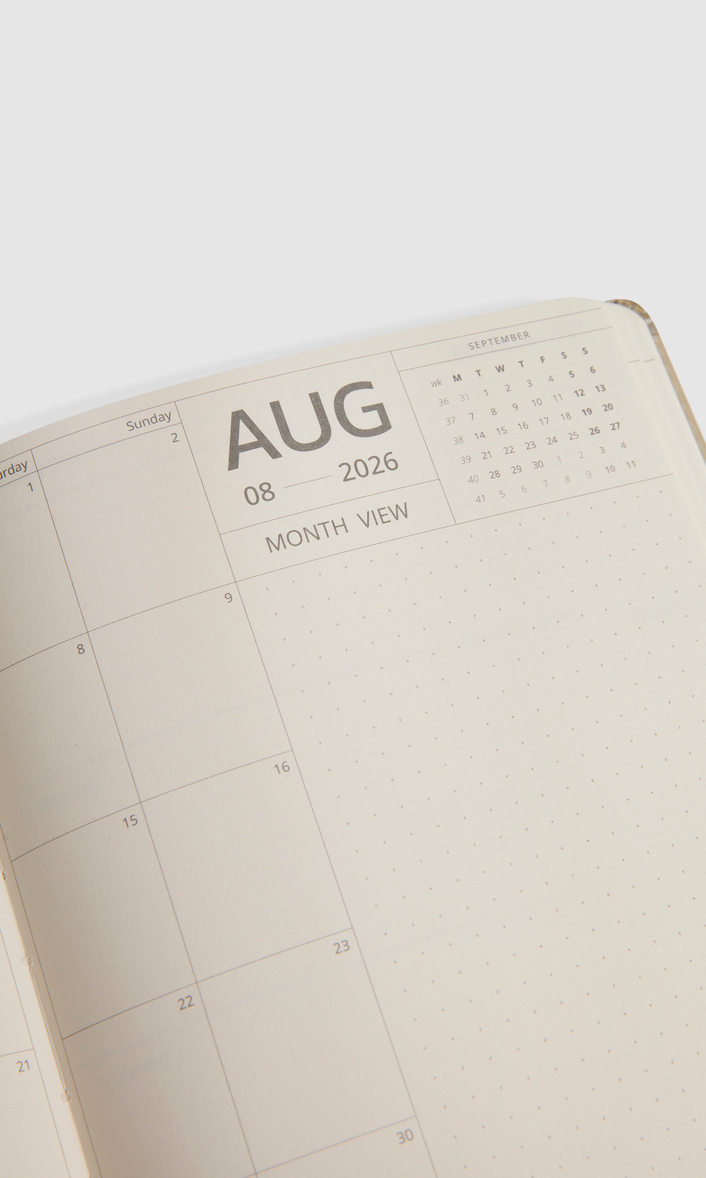 A 2026 planner created with a simple aesthetic and for practical use. The warm-toned 110 g ivory paper prevents ink bleed-through, ensuring a clean look. Lightly printed text reduces eye strain, enhancing the overall writing experience.