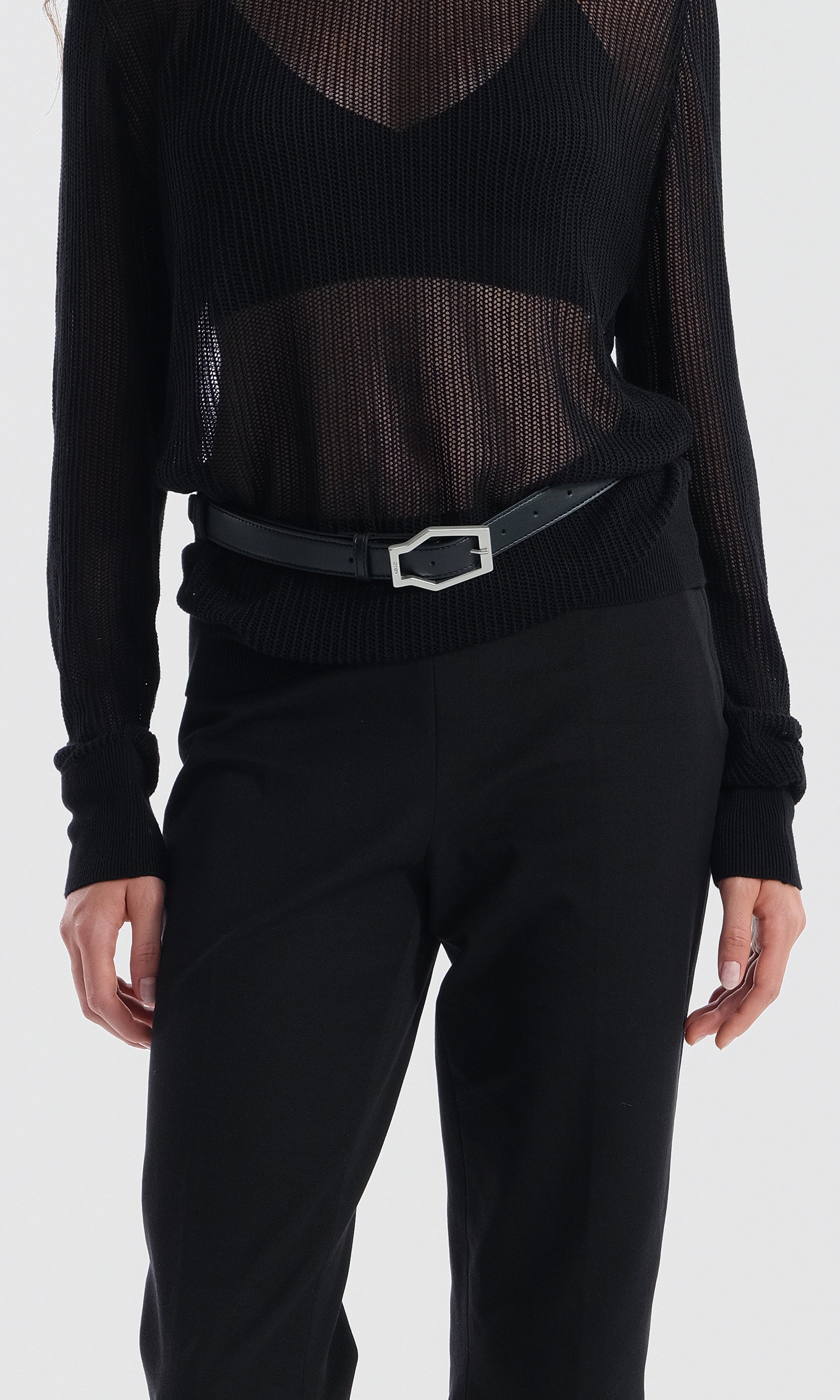 Featuring the Karel buckle, this belt is defined by a form inspired by hexagonal geometry. It defines the silhouette and strengthens its structure. Designed with a balanced thickness that feels natural in everyday wear, it pairs effortlessly with denim and tailored trousers, serving as a natural finishing touch to the look. Designed to move seamlessly between daily wear and elevated styling, it’s a reliable piece you reach for again and again.