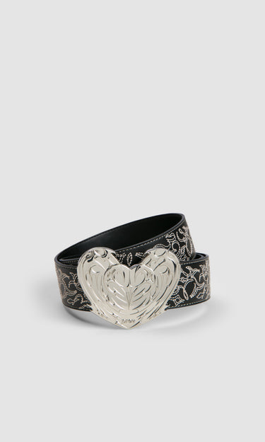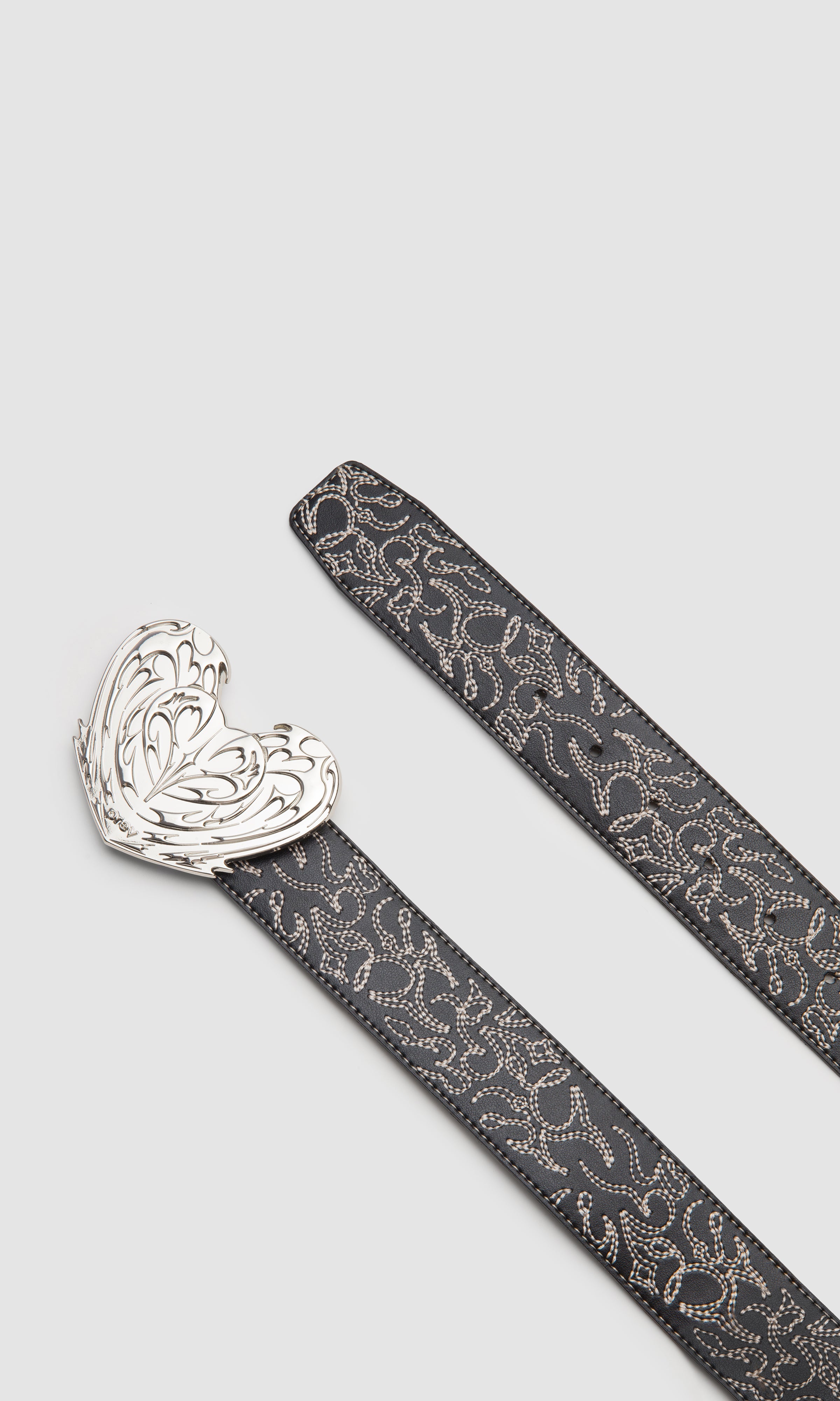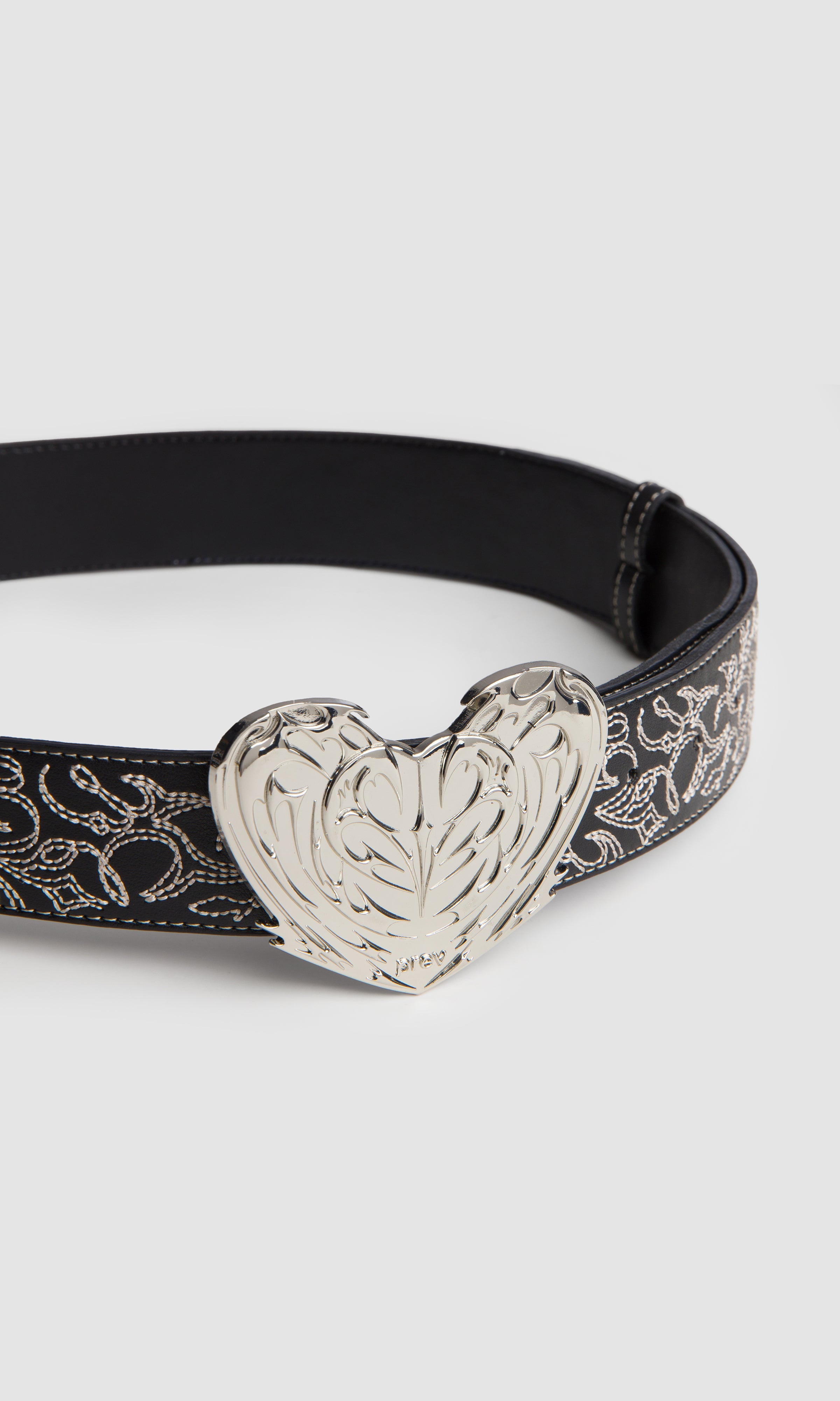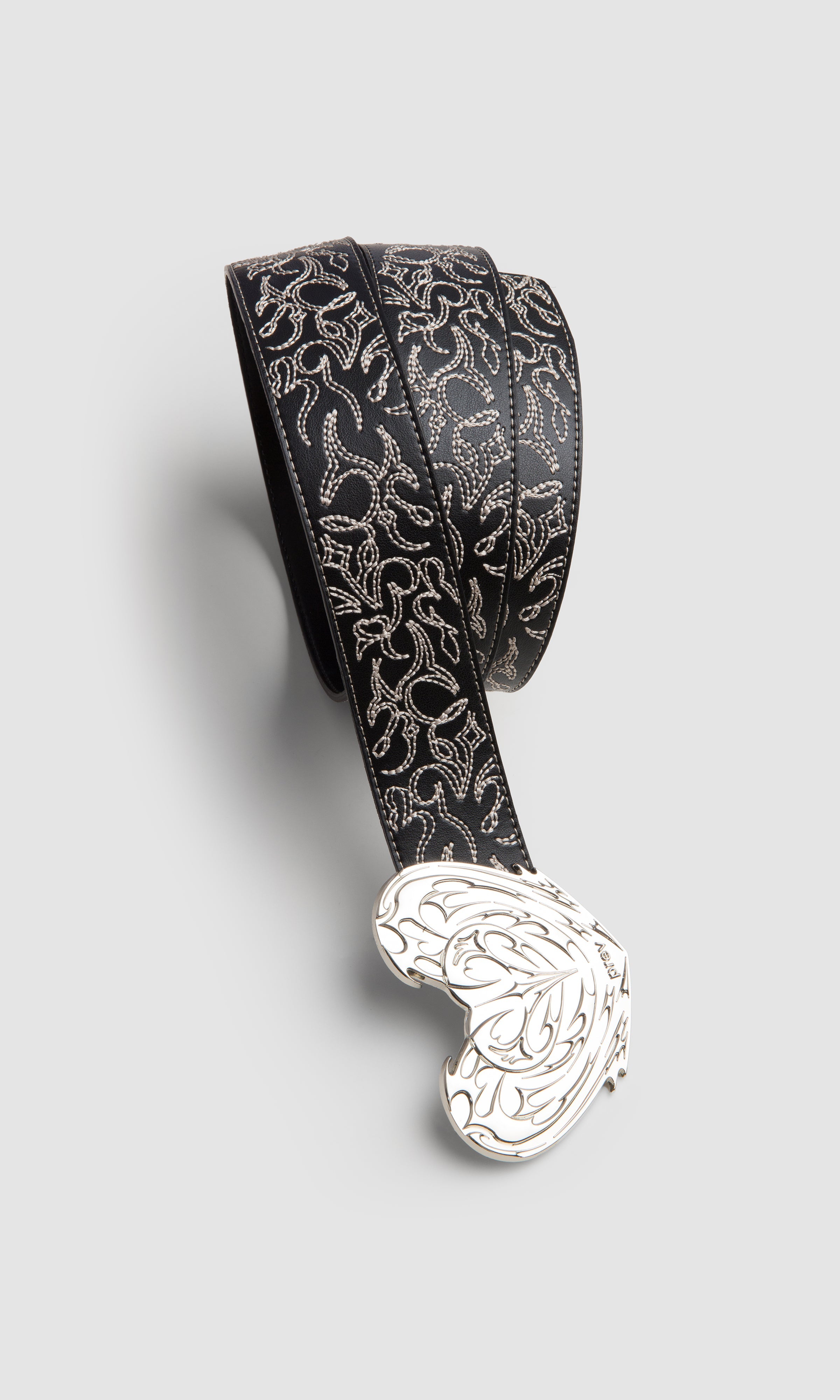 Designed to bring together Western influence and a futuristic sensibility, this belt features a custom heart-shaped Planted Love buckle created exclusively for Prev. The Regan embroidery runs continuously along the leather, emphasizing material integrity and design continuity. Finished with a classic pin buckle system, it offers an adjustable and secure fit. Bold by nature, this piece is designed as a statement. It elevates everyday outfits and adds definition to stronger silhouettes, becoming a focal point rather than an accessory.
